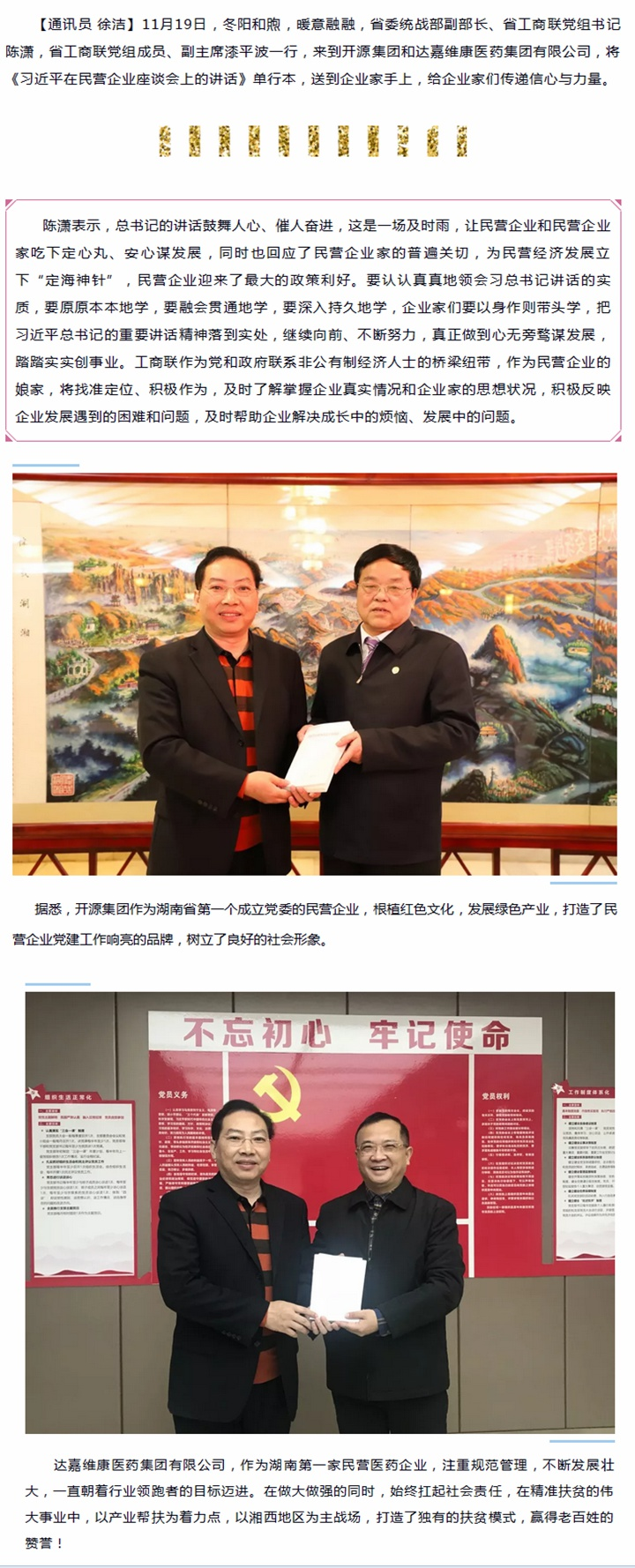 带去清风与阳光 传递信心与力量——陈潇书记送《习近平在民营企业座谈会上的讲话》进企业