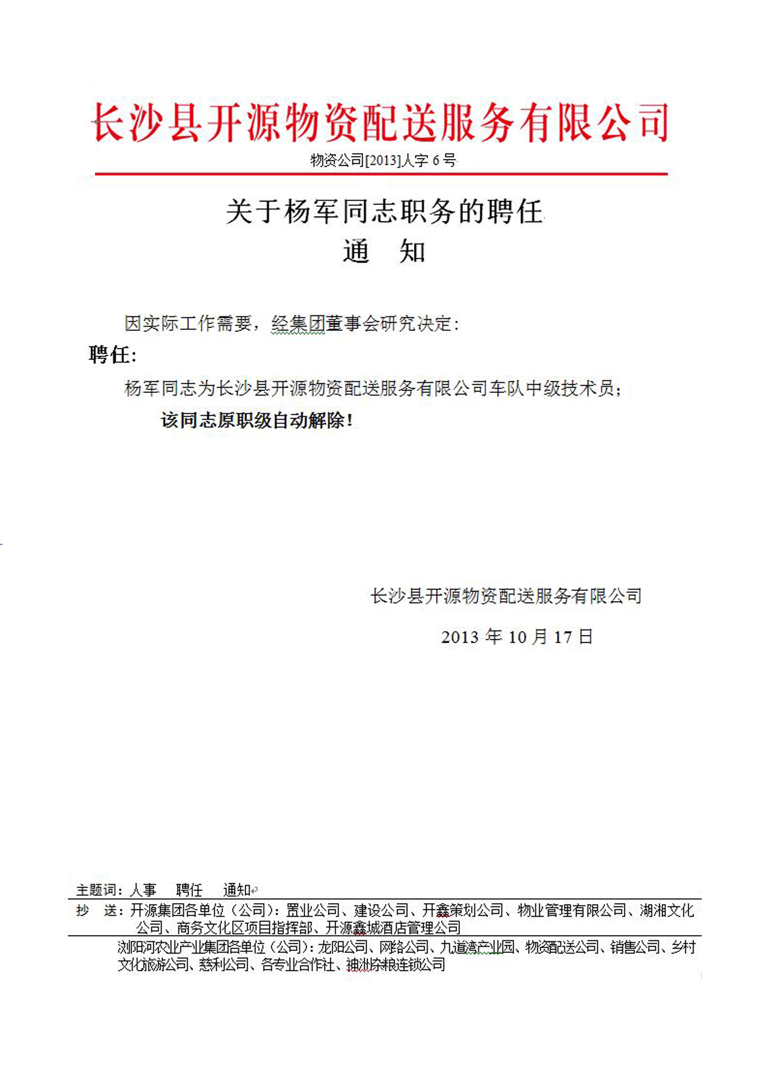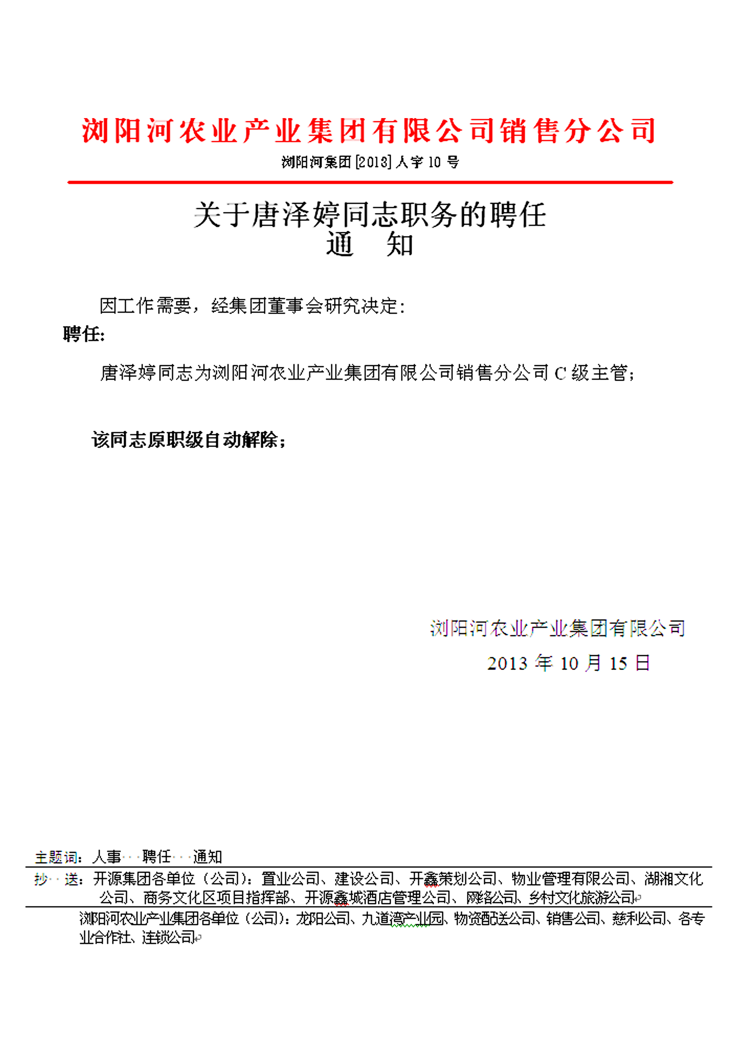 浏阳河集团(浏阳河集团[2013]人字9号)