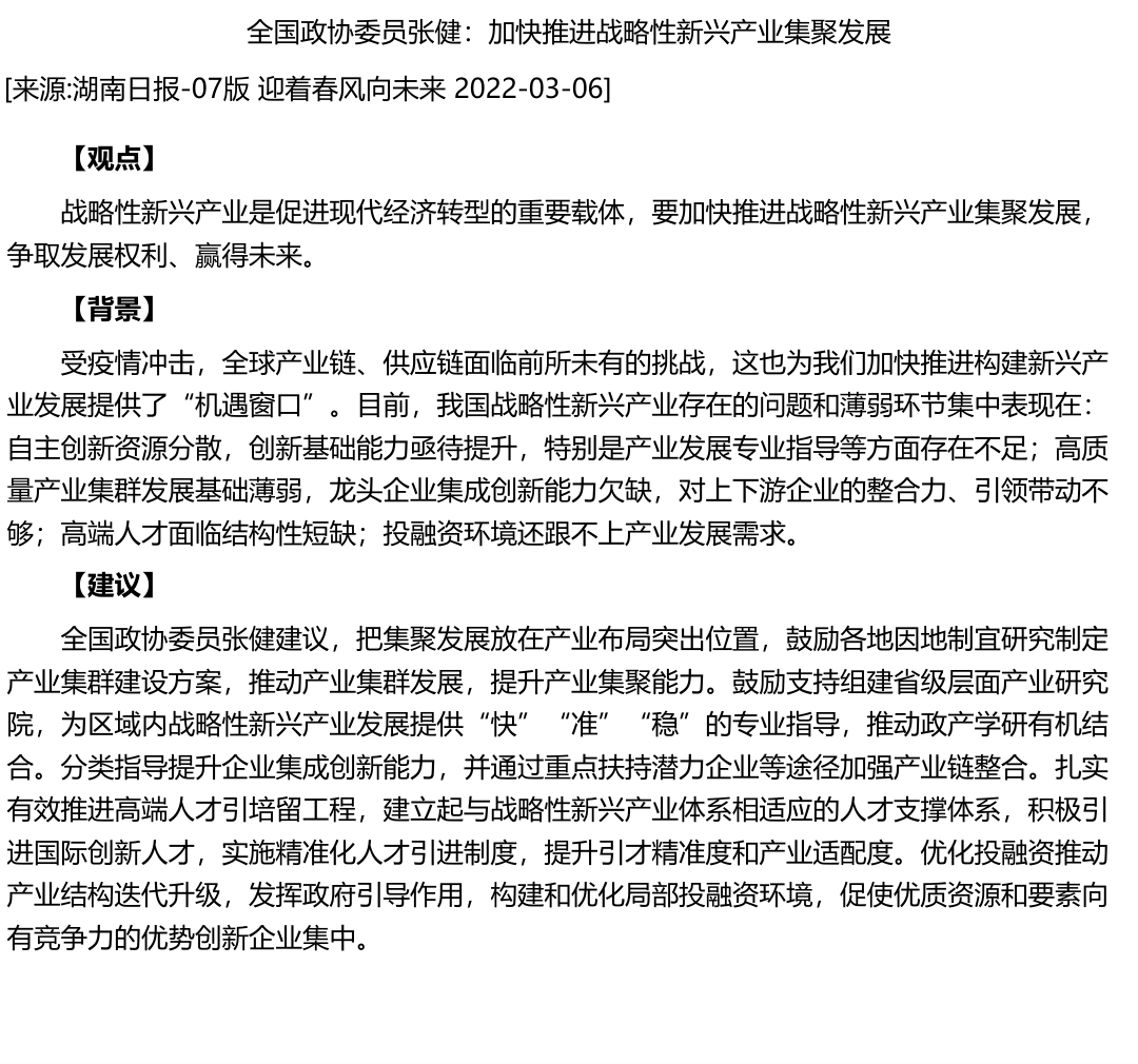 全国政协委员张健:加快推进战略性新兴产业集聚发展