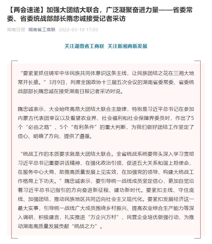 【两会速递】加强大团结大联合,广泛凝聚奋进力量——省委常委、省委统战部部长隋忠诚接受记者采访