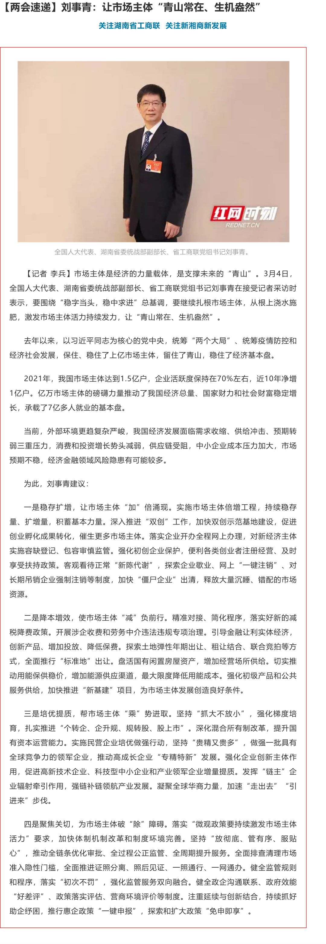【两会速递】刘事青:让市场主体“青山常在、生机盎然”